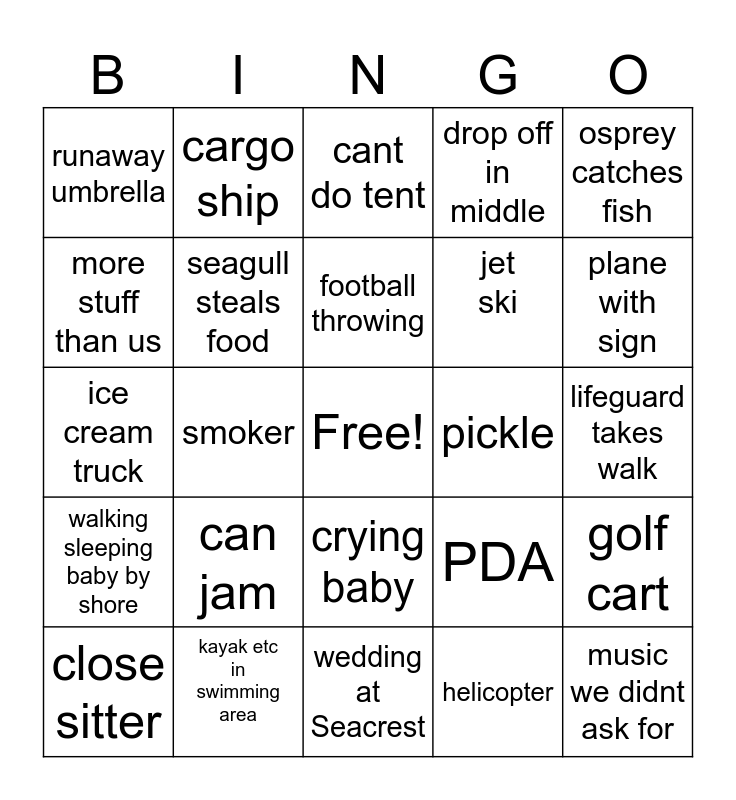 This bingo card has a free space and 29 words: close sitter, loud talker, smoker, speedo, runaway umbrella, cant do tent, seagull steals food, can jam, pickle, kayak etc in swimming area, lifeguard takes walk, music we didnt ask for, wedding at Seacrest, helicopter, plane with sign, dog on beach, crying baby, walking sleeping baby by shore, osprey catches fish, ice cream truck, PDA, MARCO POLO, jet ski, more stuff than us, drop off in middle, cargo ship, golf cart, football throwing and complaint about seaweed.
