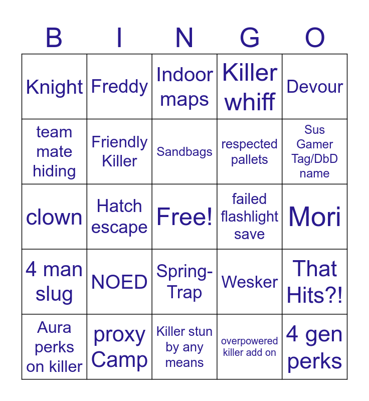 This bingo card has a free space and 24 words: NOED, proxy Camp, Sandbags, Aura perks on killer, Devour, Knight, team mate hiding, Freddy, failed flashlight save, Spring-Trap, respected pallets, clown, Wesker, That Hits?!, Friendly Killer, overpowered killer add on, Mori, Indoor maps, Sus Gamer Tag/DbD name, Hatch escape, 4 gen perks, 4 man slug, Killer whiff and Killer stun by any means.