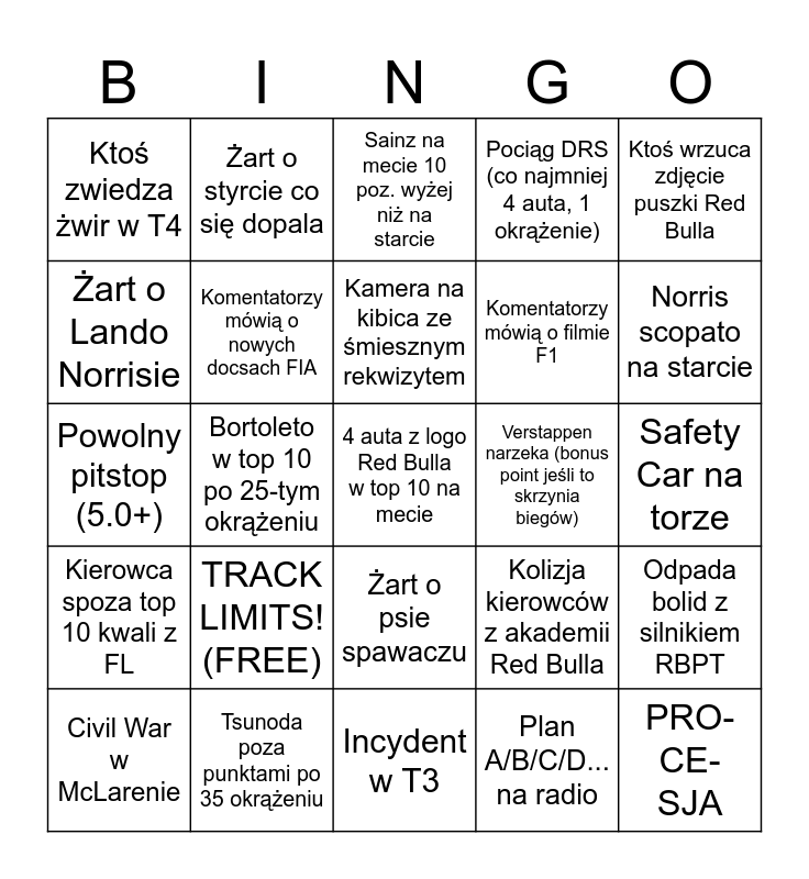 This bingo card has 25 words: TRACK LIMITS! (FREE), Incydent w T3, Kamera na kibica ze śmiesznym rekwizytem, Civil War w McLarenie, Ktoś wrzuca zdjęcie puszki Red Bulla, Ktoś zwiedza żwir w T4, Żart o Lando Norrisie, Żart o styrcie co się dopala, Verstappen narzeka (bonus point jeśli to skrzynia biegów), Żart o psie spawaczu, Komentatorzy mówią o filmie F1, Powolny pitstop (5.0+), Kolizja kierowców z akademii Red Bulla, Odpada bolid z silnikiem RBPT, Komentatorzy mówią o nowych docsach FIA, PRO-CE-SJA, Safety Car na torze, Sainz na mecie 10 poz. wyżej niż na starcie, Norris scopato na starcie, Bortoleto w top 10 po 25-tym okrążeniu, 4 auta z logo Red Bulla w top 10 na mecie, Tsunoda poza punktami po 35 okrążeniu, Kierowca spoza top 10 kwali z FL, Pociąg DRS (co najmniej 4 auta, 1 okrążenie) and Plan A/B/C/D... na radio.