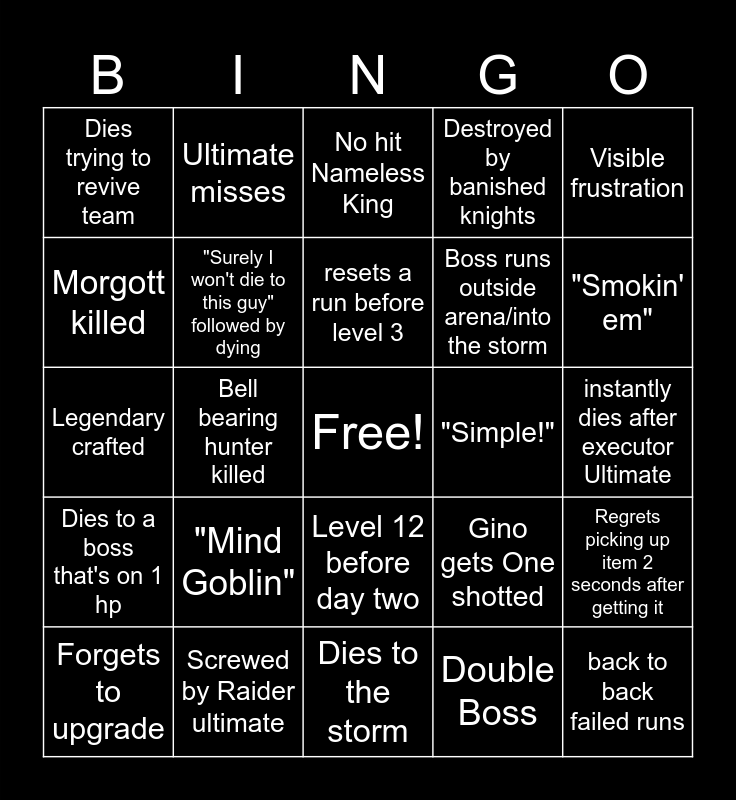 This bingo card has a free space and 24 words: "Mind Goblin", Screwed by Raider ultimate, resets a run before level 3, Forgets to upgrade, Visible frustration, Dies trying to revive team, Morgott killed, Ultimate misses, "Simple!", Level 12 before day two, Boss runs outside arena/into the storm, Legendary crafted, Gino gets One shotted, Regrets picking up item 2 seconds after getting it, "Surely I won't die to this guy" followed by dying, Double Boss, instantly dies after executor Ultimate, No hit Nameless King, "Smokin' em", Bell bearing hunter killed, back to back failed runs, Dies to a boss that's on 1 hp, Destroyed by banished knights and Dies to the storm.