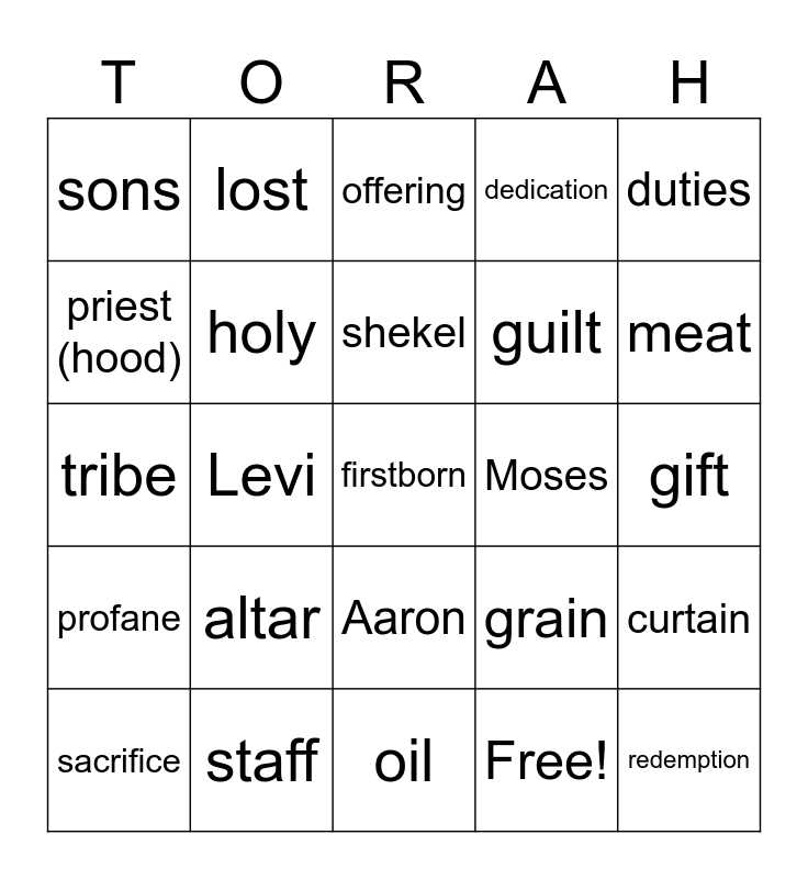 This bingo card has 30 words: staff, tabernacle, Levi, tent, sons, offering, holy, Aaron, Moses, oil, gift, firstborn, Free!, redemption, meat, tithe, grain, profane, altar, duties, tribe, rebels, lost, guilt, priest (hood), dedication, curtain, sacrifice, shekel and wine.
