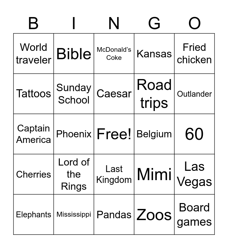 This bingo card has a free space and 24 words: Lord of the Rings, Mississippi, Caesar, Elephants, Fried chicken, World traveler, Tattoos, Bible, Belgium, Last Kingdom, Road trips, Captain America, Mimi, Las Vegas, Sunday School, Zoos, 60, McDonald’s Coke, Outlander, Phoenix, Board games, Cherries, Kansas and Pandas.