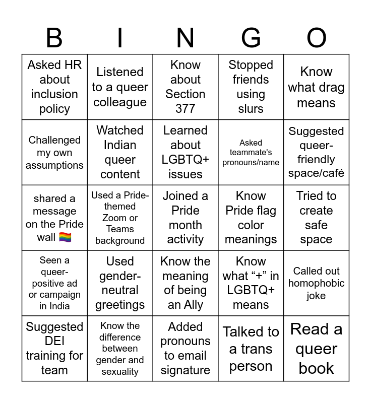 This bingo card has 25 words: Used gender-neutral greetings, Added pronouns to email signature, Learned about LGBTQ+ issues, Suggested DEI training for team, Know what drag means, Asked HR about inclusion policy, Challenged my own assumptions, Listened to a queer colleague, Know Pride flag color meanings, Know the meaning of being an Ally, Asked teammate's pronouns/name, shared a message on the Pride wall 🏳️🌈, Know what “+” in LGBTQ+ means, Called out homophobic joke, Watched Indian queer content, Read a queer book, Tried to create safe space, Know about Section 377, Suggested queer-friendly space/café, Used a Pride-themed Zoom or Teams background, Joined a Pride month activity, Know the difference between gender and sexuality, Seen a queer-positive ad or campaign in India, Stopped friends using slurs and Talked to a trans person.