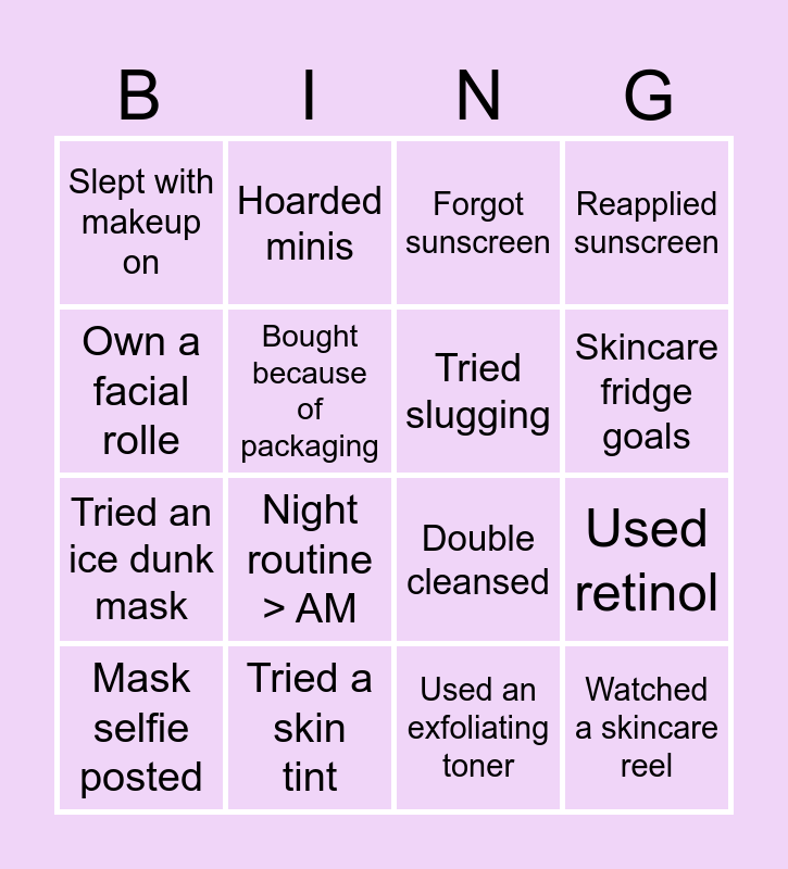 This bingo card has 16 words: Tried a skin tint, Used retinol, Forgot sunscreen, Slept with makeup on, Tried an ice dunk mask, Hoarded minis, Double cleansed, Used an exfoliating toner, Own a facial rolle, Bought because of packaging, Mask selfie posted, Reapplied sunscreen, Night routine > AM, Skincare fridge goals, Tried slugging and Watched a skincare reel.