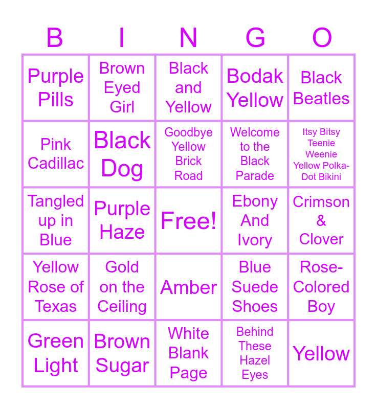 This bingo card has a free space and 47 words: Little Red Corvette, Yellow, Blue (Da Ba Dee), White Blank Page, Gold on the Ceiling, Orange Crush, Brown Eyed Girl, Paint It, Black, Pink Cadillac, Yellow Submarine, Black Dog, Bodak Yellow, Rose-Colored Boy, Blue Suede Shoes, Black Dog, 99 Red Balloons, Goodbye Yellow Brick Road, Ebony And Ivory, Red Red Wine, Black Beatles, Purple Haze, Behind These Hazel Eyes, Purple Pills, Welcome to the Black Parade, White Wedding, Itsy Bitsy Teenie Weenie Yellow Polka-Dot Bikini, Green Light, Back in Black, Amber, Yellow Rose of Texas, Red Solo Cup, Big Green Tractor, Pink, Gold Dust Woman, Mellow Yellow, Brown Sugar, Crimson & Clover, Red, White Rabbit, White Flag, Blue Jeans, Black and Yellow, Tangled up in Blue, Behind Blue Eyes, Lavender Haze, Counting Blue Cars and Pink Pony Club.