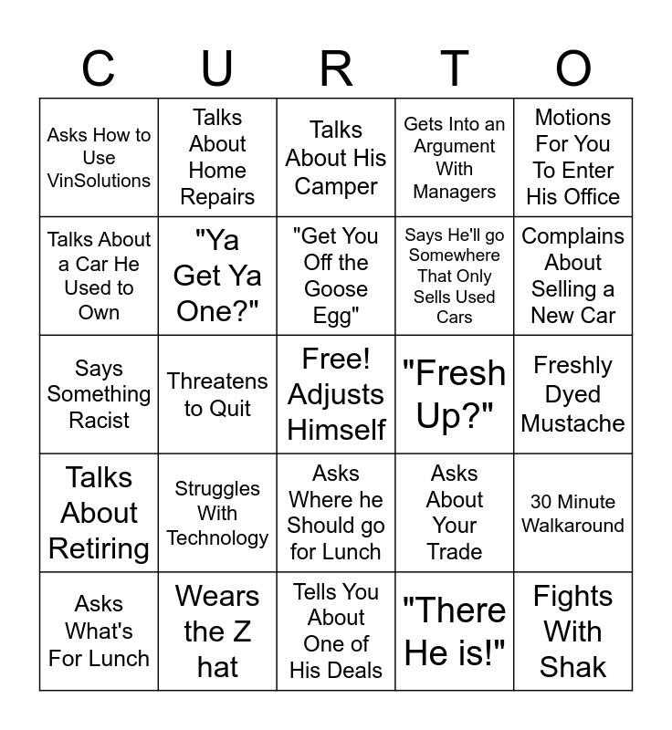 This bingo card has a free space and 32 words: "There He is!", Shows You a Funny Video, Threatens to Quit, Talks About Fishing, Talks About Retiring, "Ya Get Ya One?", Motions For You To Enter His Office, 30 Minute Walkaround, Talks About Home Repairs, "Need to Get the Yard Mowed", "Get You Off the Goose Egg", Talks About His Camper, Asks Where the Internet Rotation is at, "Where You at for the Month?", "Fresh Up?", You Greet a Guest That's Here For Curt, Asks What's For Lunch, Says Something Racist, Asks Where he Should go for Lunch, Struggles With Technology, Asks About Your Trade, Gets the Phone Up, Freshly Dyed Mustache, Wears the Z hat, Fights With Shak, Gets Into an Argument With Managers, Says He'll go Somewhere That Only Sells Used Cars, Talks About a Car He Used to Own, Asks How to Use VinSolutions, Tells You About One of His Deals, Talks to You in the Bathroom and Complains About Selling a New Car.