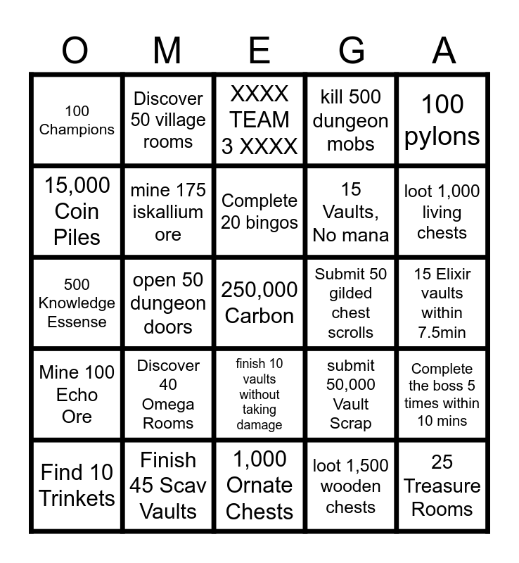 This bingo card has 25 words: Discover 40 Omega Rooms, 1,000 Ornate Chests, Complete 20 bingos, Find 10 Trinkets, 100 pylons, 100 Champions, 15,000 Coin Piles, Discover 50 village rooms, Submit 50 gilded chest scrolls, finish 10 vaults without taking damage, 15 Vaults, No mana, 500 Knowledge Essense, submit 50,000 Vault Scrap, Complete the boss 5 times within 10 mins, mine 175 iskallium ore, 25 Treasure Rooms, 15 Elixir vaults within 7.5min, XXXX TEAM 3 XXXX, loot 1,000 living chests, open 50 dungeon doors, 250,000 Carbon, Finish 45 Scav Vaults, Mine 100 Echo Ore, kill 500 dungeon mobs and loot 1,500 wooden chests.