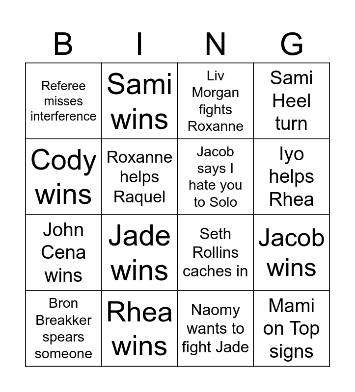 This bingo card has 16 words: Rhea wins, Jacob wins, Liv Morgan fights Roxanne, Referee misses interference, John Cena wins, Sami wins, Seth Rollins caches in, Naomy wants to fight Jade, Cody wins, Roxanne helps Raquel, Bron Breakker spears someone, Sami Heel turn, Jade wins, Iyo helps Rhea, Jacob says I hate you to Solo and Mami on Top signs.