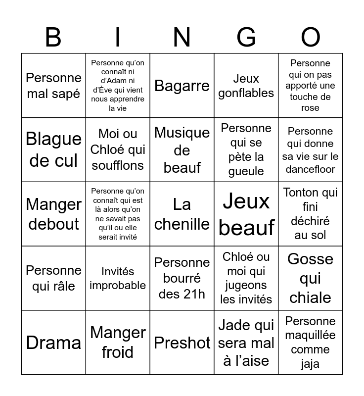 This bingo card has a free space and 24 words: Invités improbable, Manger froid, Musique de beauf, Drama, Personne qui on pas apporté une touche de rose, Personne mal sapé, Blague de cul, Personne qu’on connaît ni d’Adam ni d’Ève qui vient nous apprendre la vie, Jeux beauf, Personne bourré des 21h, Personne qui se pète la gueule, Manger debout, Chloé ou moi qui jugeons les invités, Gosse qui chiale, Moi ou Chloé qui soufflons, Jade qui sera mal à l’aise, Tonton qui fini déchiré au sol, Bagarre, Personne qui donne sa vie sur le dancefloor, Personne qu’on connaît qui est là alors qu’on ne savait pas qu’il ou elle serait invité, Personne maquillée comme jaja, Personne qui râle, Jeux gonflables and Preshot.