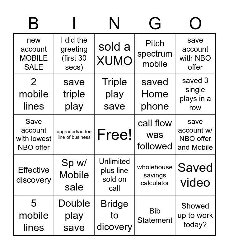 This bingo card has a free space and 24 words: Sp w/ Mobile sale, Double play save, Triple play save, 5 mobile lines, save account with NBO offer, new account MOBILE SALE, 2 mobile lines, I did the greeting (first 30 secs), call flow was followed, Unlimited plus line sold on call, saved Home phone, Save account with lowest NBO offer, wholehouse savings calculator, Saved video, save triple play, Bib Statement, save account w/ NBO offer and Mobile, sold a XUMO, saved 3 single plays in a row, upgraded/added line of business, Showed up to work today?, Effective discovery, Pitch spectrum mobile and Bridge to dicovery.