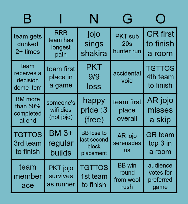 This bingo card has a free space and 85 words: jojo mentions physically sweating, jojo pep talk, jojo sings shakira, jojo swears despite being pg team, jojo takes on a leadership role, jojo talks bad about herself, jojo beats her coin record (3681), jojo first place in a game, jojo gets targeted, jojo messes up egg throw, jojo shows her shaky hands, jojo top 5 overall individual placement, team first place in a game, team first place overall, team gets dunked, team gets dunked 2+ times, team member ace, team receives a decision dome item, top 3 overall team placement, we make it to dodgebolt, we win dodgebolt., accidental void, audience votes for preferred game, mid-game substitution, someone's wifi dies (not jojo), tactical void (any team member), technical difficulties (not jojo), BM 1 gold build, BM 2 gold builds, BM 3+ gold builds, BM 3+ regular builds, BM 5+ regular builds, BM misplace a block by one, BM more than 50% completed at end, BM not skipped, BM skipped, TGTTOS 1st team to finish, TGTTOS 2nd team to finish, TGTTOS 3rd team to finish, TGTTOS 4th team to finish, TGTTOS jojo accidentally falls, TGTTOS jojo gets punched, TGTTOS jojo punches someone, TGTTOS someone steals jojos chicken, RRR falls in lava during gold rush, RRR not enough powered rails, RRR places rail on temporary blocks, RRR team gets bonus room, RRR team goes over obstacles, RRR team goes through obstacles, RRR team has longest path, PKT 9/9 loss, PKT 9/9 win, PKT full team survives as runner, PKT jojo hunts 3 rounds, PKT jojo hunts 4 rounds, PKT jojo survives as runner, PKT sub 20s hunter run, PKT sub 30s hunter run, SG jojo 3+ kills, SG jojo 5+ kills, SG jojo 7+ kills, SG jojo or teammate dies to border, SG last team standing, SG team gets an airdrop, GR first to finish a room, GR last to finish a room, GR team top 3 in a room, GR team top 3 in 3+ rooms, GR jojo says boyoyoys, GR redstone placement room, BB jojo 10+ kills overall, BB jojo 5+ kills overall, BB jojo ace, BB lose round from wool rush, BB lose to last second block placement, BB win round from wool rush, BB win to last second block placement, AR jojo fastest lap, AR jojo gets a skip, AR jojo misses a skip, AR jojo misses jump pad, AR jojo notices elytra/trident issue, AR jojo serenades us and AR jojo top 5.