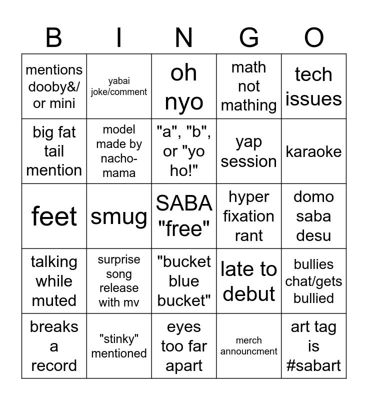This bingo card has a free space and 24 words: surprise song release with mv, "stinky" mentioned, "a", "b", or "yo ho!", breaks a record, tech issues, mentions dooby&/ or mini, big fat tail mention, yabai joke/comment, hyper fixation rant, "bucket blue bucket", yap session, feet, late to debut, bullies chat/gets bullied, model made by nacho-mama, merch announcment, domo saba desu, oh nyo, karaoke, smug, art tag is #sabart, talking while muted, math not mathing and eyes too far apart.