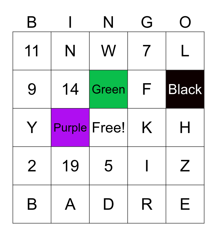 This bingo card has a free space and 54 words: 1, 2, 3, 4, 5, 6, 7, 8, 9, 10, 11, 12, A, B, C, D, E, F, G, H, I, J, K, L, M, N, O, P, Q, R, S, T, U, V, W, X, Y, Z, 13, 14, 15, 16, 17, 18, 19, 20, Red, Blue, Green, Purple, Black, White, Pink and Grey.