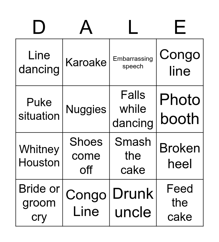 This bingo card has 18 words: Shoes come off, Feed the cake, Embarrassing speech, Line dancing, Smash the cake, Congo line, Bride or groom cry, Karoake, Photo booth, Whitney Houston, Drunk uncle, Puke situation, Broken heel, Nuggies, Falls while dancing, Free Space!, Congo Line and Smash the cake.