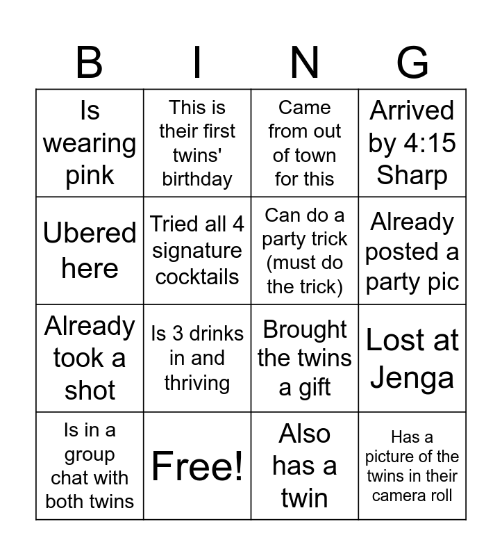 This bingo card has 21 words: Free!, Went to the twins' last birthday, This is their first twins' birthday, Birthday is also in June, Also has a twin, Can do a party trick (must do the trick), Is wearing pink, Came from out of town for this, Brought the twins a gift, Already posted a party pic, Already took a shot, Arrived by 4:15 Sharp, Has a picture of the twins in their camera roll, Played a sport with the twins, Tried all 4 signature cocktails, Has vacationed with the twins, Is in a group chat with both twins, Is 3 drinks in and thriving, Ubered here, Lost at Jenga and Took a pic with the backdrop.