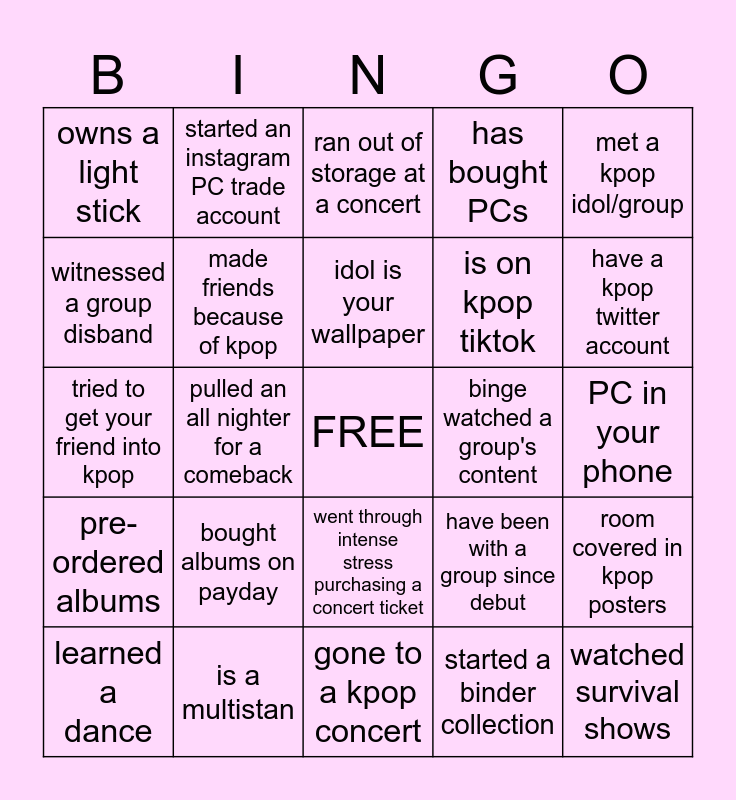 This bingo card has a free space and 24 words: learned a dance, bought albums on payday, idol is your wallpaper, started a binder collection, met a kpop idol/group, owns a light stick, started an instagram PC trade account, ran out of storage at a concert, binge watched a group's content, PC in your phone, tried to get your friend into kpop, made friends because of kpop, have been with a group since debut, room covered in kpop posters, witnessed a group disband, is a multistan, gone to a kpop concert, has bought PCs, have a kpop twitter account, pre-ordered albums, pulled an all nighter for a comeback, went through intense stress purchasing a concert ticket, is on kpop tiktok and watched survival shows.