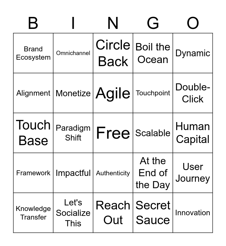 This bingo card has a free space and 99 words: Synergy, Leverage, Actionable Insights, Circle Back, Deep Dive, Unpack That, Bandwidth, Low-Hanging Fruit, Ideation, Pivot, Thought Leadership, Growth Hacking, Snackable Content, Authenticity, Scale, Brand Ecosystem, Omnichannel, Hyper-Personalization, Best Practices, Move the Needle, Future-Proofing, Holistic Approach, Democratization, Content is King, Stakeholder Alignment, User Journey, Agile, Brand Purpose, Creator Economy, Gamification, Reach Out, Secret Sauce, Learnings, Data-Driven, Paradigm Shift, Touch Base, Take This Offline, Core Competency, Drill Down, Impactful, On My Radar, Double-Click, Boil the Ocean, Let's Socialize This, Value-Add, Mission-Critical, Right-Sizing, Optimize, Empower, Seamless Integration, Disruptive, Innovation, At the End of the Day, Get Our Ducks in a Row, Ping Me, Low-Hanging Fruit, Let's Put a Pin in That, Run It Up the Flagpole, Think Outside the Box, Blue-Sky Thinking, Give 110%, Table That, It Is What It Is, Full-Service Solution, Robust, Dynamic, Game-Changer, Cutting-Edge, Next-Gen, Framework, Ecosystem, Touchpoint, Alignment, Granular, Mindshare, Bleeding-Edge, Monetize, Operationalize, Core Values, Quick Win, Scalable, Customer-Centric, Circle the Wagons, Let's Take a Step Back, New Normal, Open the Kimono, Peel Back the Onion, Strategic Imperative, Human Capital, Knowledge Transfer, Run the Numbers, Let's Connect, Streamline, Vertical, Band-Aid Solution, Paradigm, Big Picture, Drill Down and Get Granular.