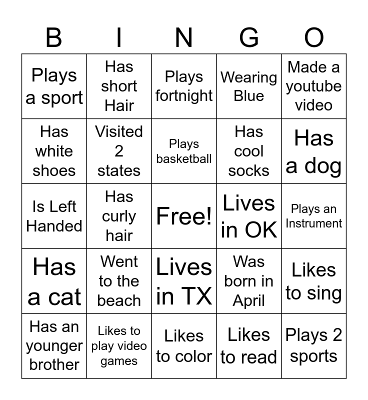 This bingo card has a free space and 29 words: Has an younger brother, Has a older sister, Has curly hair, Likes to swim, Plays a sport, Plays fortnight, Visited 2 states, Went to the beach, Lives in OK, Likes to play video games, Plays an Instrument, Plays 2 sports, Likes to color, Likes to read, Has a dog, Saw a movie this summer, Lives in TX, Has a cat, Made a youtube video, Is Left Handed, Was born in April, Was born in December, Has cool socks, Has white shoes, Wearing Blue, Has short Hair, Likes to sing, Plays basketball and Is wearing not socks.