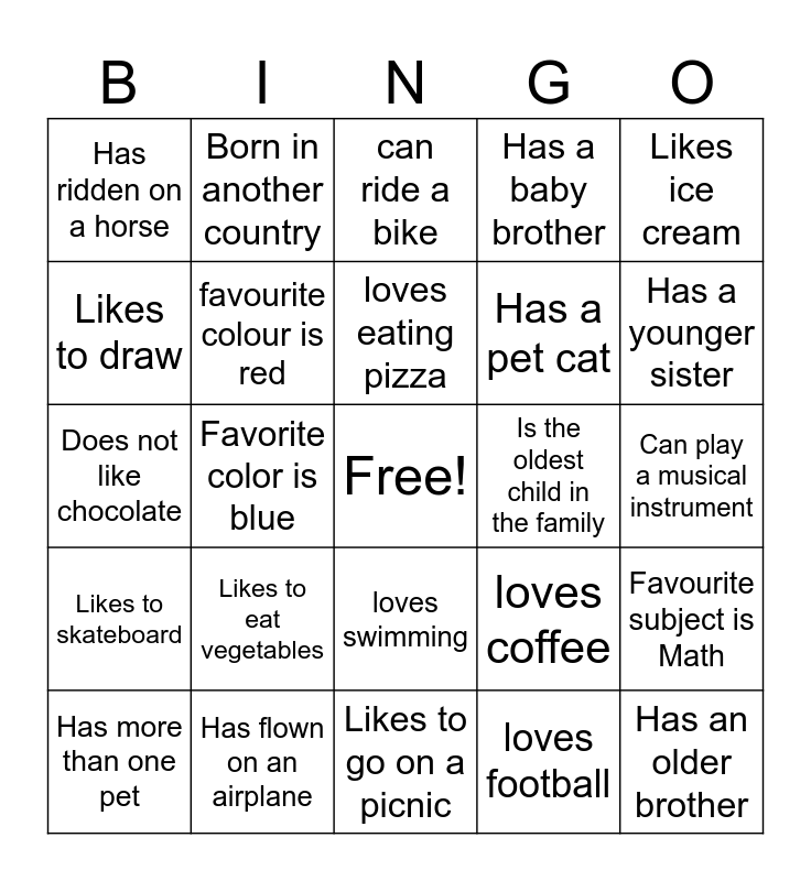 This bingo card has a free space and 24 words: Likes to eat vegetables, Has flown on an airplane, loves eating pizza, Has more than one pet, Likes ice cream, Has ridden on a horse, Likes to draw, Born in another country, Is the oldest child in the family, loves swimming, Has a pet cat, Does not like chocolate, loves coffee, Favourite subject is Math, favourite colour is red, loves football, Can play a musical instrument, can ride a bike, Has a younger sister, Favorite color is blue, Has an older brother, Likes to skateboard, Has a baby brother and Likes to go on a picnic.