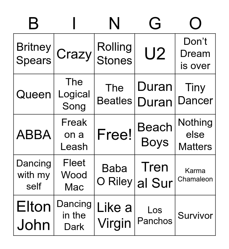 This bingo card has a free space and 38 words: Down Under, Under Presure, Just cant get enough, The Logical Song, Karma Chamaleon, Fleet Wood Mac, The Beatles, Dreams, Don’t Dream is over, Duran Duran, Freak on a Leash, U2, Survivor, Nothing else Matters, Queen, Dancing with my self, We Will Rock you, Rolling Stones, Satisfaction, Beach Boys, Britney Spears, Dancing in the Dark, Tiny Dancer, Elton John, Back Street Boys, Like a Virgin, Forever Young, Wish you were here, Wonderwall, Sweet Child OMine, Guns N Roses, Baba O Riley, Los Panchos, Crazy, Aerosmith, Tren al Sur, ABBA and The Outfield.