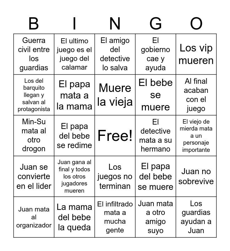 This bingo card has a free space and 24 words: Juan gana al final y todos los otros jugadores mueren, La mama del bebe la queda, Muere la vieja, Juan mata al organizador, Los vip mueren, Guerra civil entre los guardias, Los del barquito llegan y salvan al protagonista, El ultimo juego es el juego del calamar, El detective mata a su hermano, Los juegos no terminan, El bebe se muere, Min-Su mata al otro drogon, El papa del bebe se muere, Juan no sobrevive, El papa mata a la mama, Juan mata a otro amigo suyo, El viejo de mierda mata a un personaje importante, El amigo del detective lo salva, Al final acaban con el juego, El papa del bebe se redime, Los guardias ayudan a Juan, Juan se convierte en el lider, El gobierno cae y ayuda and El infiltrado mata a mucha gente.