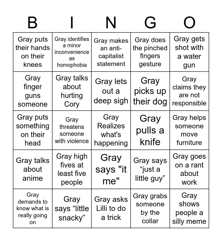 This bingo card has a free space and 27 words: Gray says “just a little guy”, Gray flares their eyes and stares into the void, Gray picks up their dog, Gray asks Lilli to do a trick, Gray finger guns someone, Gray makes an anti-capitalist statement, Gray identifies a minor inconvenience as homophobia, Gray talks about anime, Gray pulls a knife, Gray goes on a rant about work, Gray puts something on their head, Gray does the pinched fingers gesture, Gray demands to know what is really going on, Gray says “little snacky”, Gray claims they are not responsible, Gray says “my guy”, Gray talks about hurting Cory, Gray lets out a deep sigh, Gray high fives at least five people, Gray puts their hands on their knees, Gray helps someone move furniture, Gray grabs someone by the collar, Gray threatens someone with violence, Gray shows people a silly meme, Gray says "it me", Gray gets shot with a water gun and Gray retaliates to being shot with a water gun.