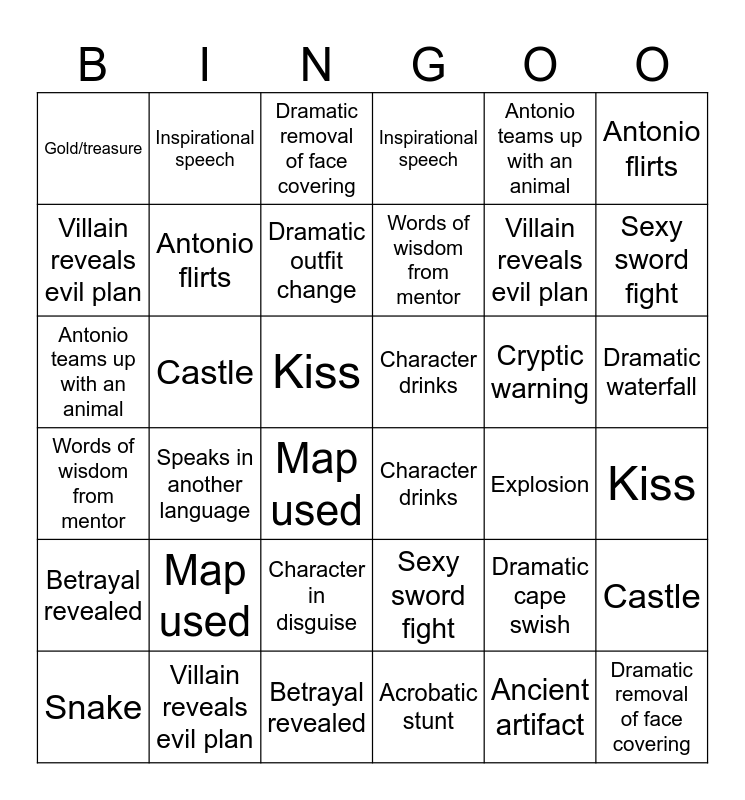 This bingo card has 75 words: Free!, Dramatic removal of face covering, Dramatic removal of face covering, Sword sound effect (shwing), Sword sound effect (shwing), Sword sound effect (shwing), Acrobatic stunt, Acrobatic stunt, Betrayal revealed, Betrayal revealed, Betrayal revealed, Antonio flirts, Antonio flirts, Antonio flirts, Sexy sword fight, Sexy sword fight, Sexy sword fight, Antonio teams up with an animal, Antonio teams up with an animal, Antonio teams up with an animal, Villain reveals evil plan, Villain reveals evil plan, Villain reveals evil plan, Inspirational speech, Inspirational speech, Fire, Fire, Weapon dropped, Weapon dropped, Weapon dropped, Snake, Slow motion, Slow motion, Words of wisdom from mentor, Words of wisdom from mentor, Dramatic outfit change, Dramatic outfit change, Kiss, Kiss, Kiss, Death, Death, Sexy accent, Sexy accent, Sexy accent, Map used, Map used, Gold/treasure, Gold/treasure, Character in disguise, Character in disguise, Dramatic waterfall, Ancient artifact, Ancient artifact, Boat, Boat, Dramatic cape swish, Dramatic cape swish, Explosives, Name mispronounced, Cryptic warning, Gross food, Big Sad Eyes look, āZā cut into something, Egg broken, Castle, Castle, Smoking, Speaks in another language, Speaks in another language, Character drinks, Character drinks, Character drinks, Explosion and Explosion.