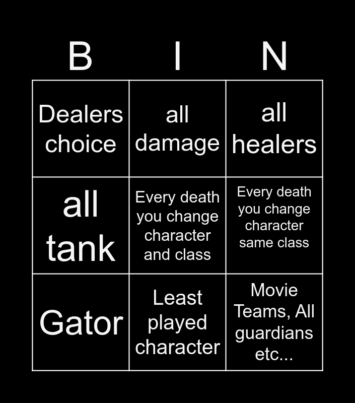 This bingo card has 9 words: Gator, all healers, all damage, all tank, Dealers choice, Every death you change character same class, Every death you change character and class, Movie Teams, All guardians etc... and Least played character.