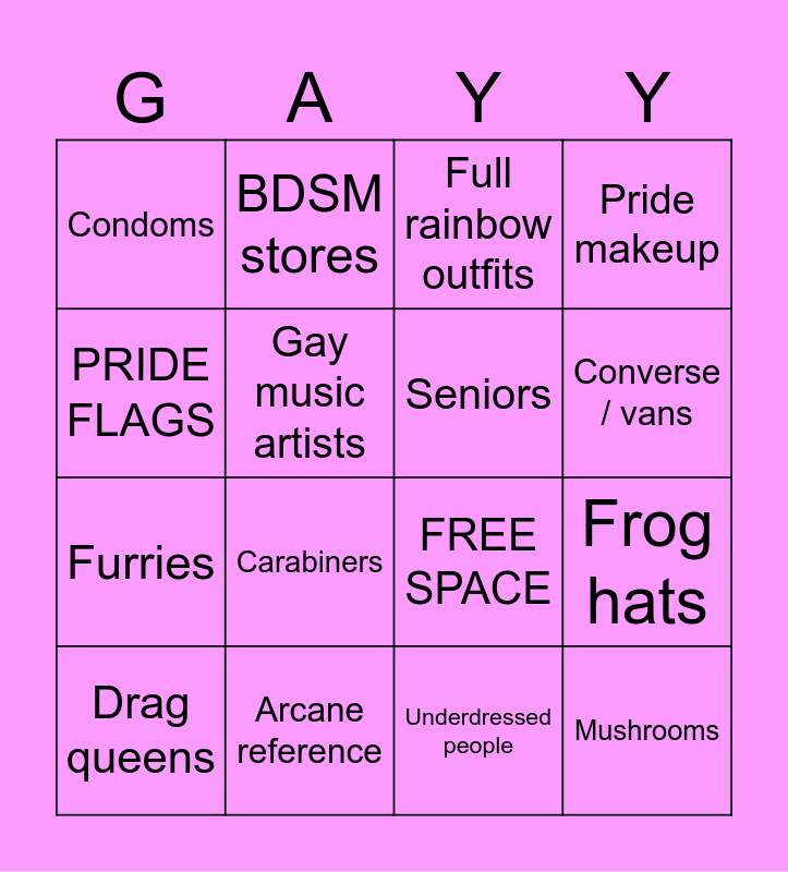 This bingo card has 16 words: Arcane reference, Frog hats, Full rainbow outfits, Condoms, Furries, BDSM stores, FREE SPACE, Underdressed people, PRIDE FLAGS, Gay music artists, Drag queens, Pride makeup, Carabiners, Converse / vans, Seniors and Mushrooms.