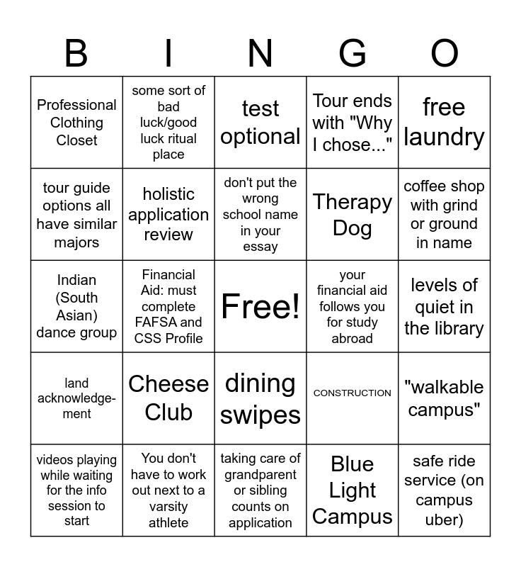 This bingo card has a free space and 24 words: Cheese Club, You don't have to work out next to a varsity athlete, don't put the wrong school name in your essay, videos playing while waiting for the info session to start, free laundry, Professional Clothing Closet, tour guide options all have similar majors, some sort of bad luck/good luck ritual place, your financial aid follows you for study abroad, dining swipes, Therapy Dog, Indian (South Asian) dance group, CONSTRUCTION, "walkable campus", holistic application review, Blue Light Campus, levels of quiet in the library, test optional, coffee shop with grind or ground in name, Financial Aid: must complete FAFSA and CSS Profile, safe ride service (on campus uber), land acknowledge-ment, Tour ends with "Why I chose..." and taking care of grandparent or sibling counts on application.