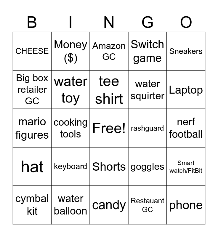 This bingo card has a free space and 28 words: Smart watch/FitBit, pool pass, water squirter, Restauant GC, Big box retailer GC, Amazon GC, Money ($), hat, rashguard, cymbal kit, mario figures, Switch game, water balloon, candy, Laptop, puppy, keyboard, water toy, tee shirt, Shorts, CHEESE, snorkel, phone, cooking tools, nerf football, goggles, Sneakers and Non-percussion instrument.