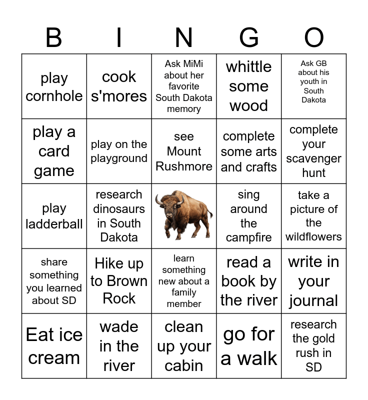 This bingo card has a free space and 24 words: Hike up to Brown Rock, wade in the river, see Mount Rushmore, Eat ice cream, Ask GB about his youth in South Dakota, play cornhole, play a card game, cook s'mores, sing around the campfire, learn something new about a family member, complete some arts and crafts, play ladderball, read a book by the river, write in your journal, play on the playground, go for a walk, take a picture of the wildflowers, Ask MiMi about her favorite South Dakota memory, complete your scavenger hunt, research dinosaurs in South Dakota, research the gold rush in SD, share something you learned about SD, whittle some wood and clean up your cabin.