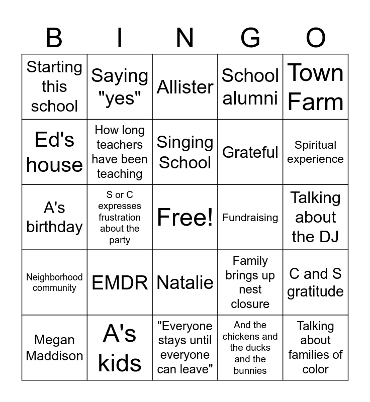 This bingo card has a free space and 24 words: EMDR, A's kids, Singing School, Megan Maddison, Town Farm, Starting this school, Ed's house, Saying "yes", Fundraising, Natalie, Grateful, A's birthday, Family brings up nest closure, C and S gratitude, How long teachers have been teaching, And the chickens and the ducks and the bunnies, Talking about the DJ, Allister, Spiritual experience, S or C expresses frustration about the party, Talking about families of color, Neighborhood community, School alumni and "Everyone stays until everyone can leave".