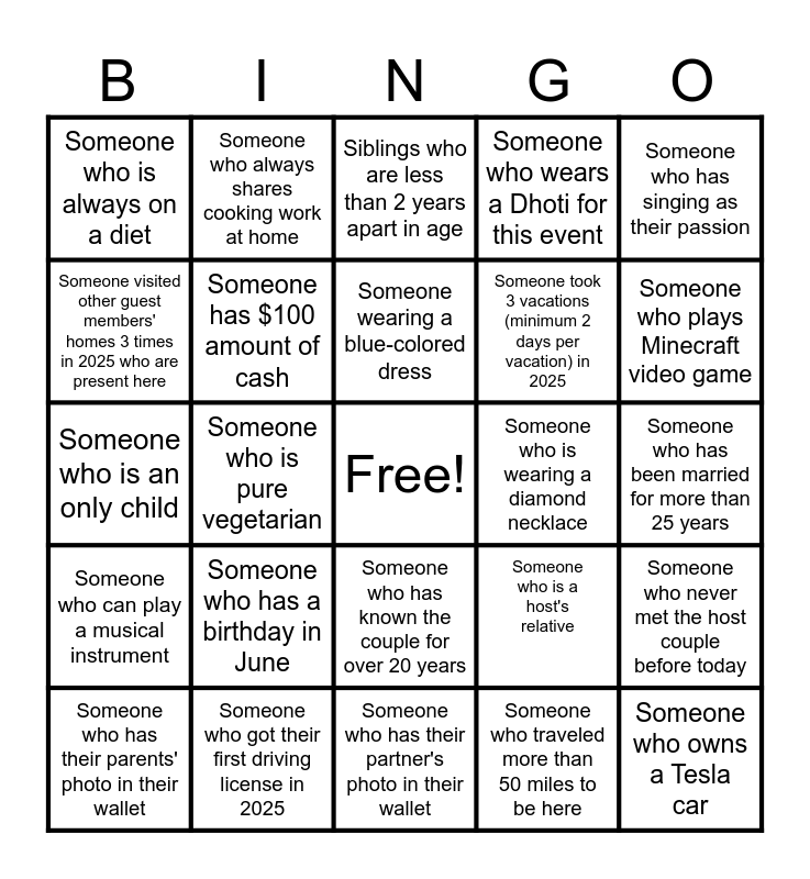 This bingo card has a free space and 26 words: Someone who has known the couple for over 20 years, Someone who traveled more than 50 miles to be here, Someone wearing a blue-colored dress, Someone who got their first driving license in 2025, Someone who has singing as their passion, Someone who is always on a diet, Someone visited other guest members' homes 3 times in 2025 who are present here, Someone who always shares cooking work at home, Someone who has been married for more than 25 years, Someone who is a host's relative, Someone took 3 vacations (minimum 2 days per vacation) in 2025, Someone who is an only child, Someone who never met the host couple before today, Someone who has their parents' photo in their wallet, Someone who is pure vegetarian, Someone who has a pet, Someone who wears a Dhoti for this event, Someone who can play a musical instrument, Siblings who are less than 2 years apart in age, Someone who owns a Tesla car, Someone who plays Minecraft video game, Someone who has their partner's photo in their wallet, Someone who is wearing a diamond necklace, Someone who has a birthday in June, Someone has $100 amount of cash and Someone who got job promotion in their office.