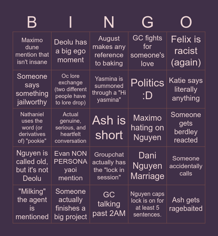 This bingo card has a free space and 34 words: Matthew/Deolu call each other twin. (Has to be both), Nguyen caps lock is on for at least 5 sentences., Convo turns to very weird biological facts, Nico hits his iconic laugh, Nguyen is called old, but it's not Deolu, Oc lore exchange (two different people have to lore drop), Felix is racist (again), "Milking" the agent is mentioned, Deolu has a big ego moment, Matthew Ash or Felix Fire emblem mention., Yasmina is summoned through a "Hi yasmina", August makes any reference to baking, Nico drops a music voice message, The entire gc is in the US, Maximo hating on Nguyen, Katie says literally anything, Someone actually finishes a big project, Nathaniel uses the word (or derivatives of) "pookie", Evan NON PERSONA yaoi mention, Dani Nguyen Marriage, Groupchat actually has the "lock in session", Ash does furry stuff, Maximo dune mention that isn't insane, Someone gets berdley reacted, GC talking past 2AM, Ash gets ragebaited, GC fights for someone's love, Deolu shills a game, Politics :D, Someone says something jailworthy, Nguyen overhead picture, Actual genuine, serious, and heartfelt conversation, Someone accidentally calls and Two full days without Undertale or Deltarune memes.