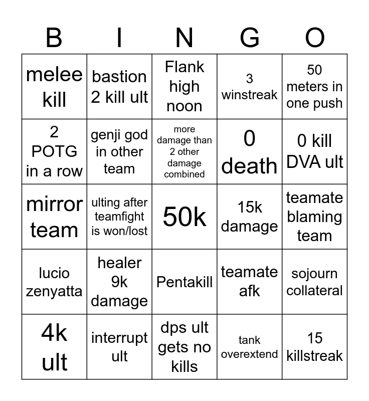 This bingo card has a free space and 24 words: healer 9k damage, interrupt ult, more damage than 2 other damage combined, 4k ult, 50 meters in one push, melee kill, 2 POTG in a row, bastion 2 kill ult, 15k damage, Pentakill, 0 death, mirror team, teamate afk, sojourn collateral, genji god in other team, tank overextend, teamate blaming team, Flank high noon, 0 kill DVA ult, ulting after teamfight is won/lost, 15 killstreak, lucio zenyatta, 3 winstreak and dps ult gets no kills.