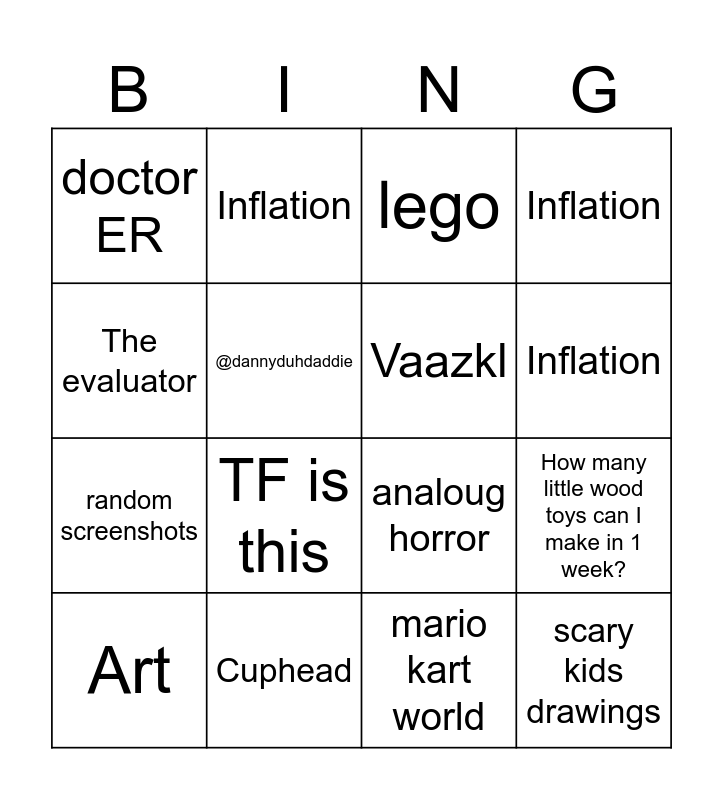 This bingo card has 19 words: analoug horror, kirby, lego, scary kids drawings, How many little wood toys can I make in 1 week?, The evaluator, mario kart world, doctor ER, Inflation, random screenshots, TF is this, @dannyduhdaddie, Vaazkl, Cuphead, Art, Inflation, Inflation, Inflation and Inflation.