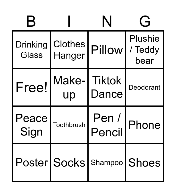 This bingo card has 16 words: Socks, Phone, Pillow, Drinking Glass, Peace Sign, Clothes Hanger, Pen / Pencil, Shampoo, Free!, Make-up, Poster, Plushie / Teddy bear, Toothbrush, Deodorant, Tiktok Dance and Shoes.