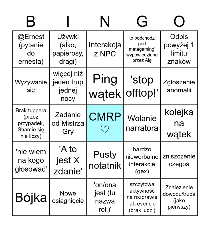 This bingo card has a free space and 24 words: 'A to jest X zdanie', Nowe osiągnięcie, Ping wątek, Bójka, Odpis powyżej 1 limitu znaków, @Ernest (pytanie do ernesta), Wyzywanie się, Używki (alko, papierosy, dragi), Wołanie narratora, Pusty notatnik, 'stop offtop!', Brak tuppera (przez przypadek, Shamie się nie liczy), bardzo niewerbalne interakcje (gex), zniszczenie czegoś, więcej niż jeden trup jednej nocy, szczytowa aktywność na rozprawie lub evencie (brak ludzi), kolejka na wątek, Interakcja z NPC, Zgłoszenie anomalii, Zadanie od Mistrza Gry, Znalezienie dowodu/trupa (jako pierwszy), 'nie wiem na kogo głosować', 'to podchodzi pod metagaming' wypowiedziane przez Alę and 'on/ona jest (tu nazwa roli)'.