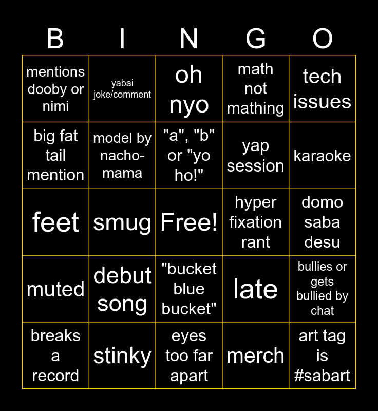 This bingo card has a free space and 24 words: debut song, stinky, "a", "b" or "yo ho!", breaks a record, tech issues, mentions dooby or nimi, big fat tail mention, yabai joke/comment, hyper fixation rant, "bucket blue bucket", yap session, feet, late, bullies or gets bullied by chat, model by nacho-mama, merch, domo saba desu, oh nyo, karaoke, smug, art tag is #sabart, muted, math not mathing and eyes too far apart.