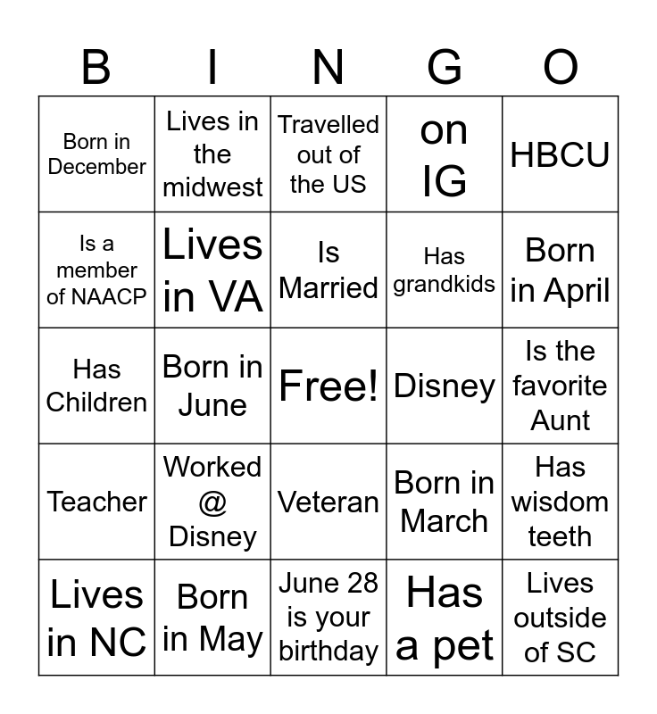 This bingo card has a free space and 24 words: Worked @ Disney, Born in May, Is Married, Lives in NC, HBCU, Born in December, Is a member of NAACP, Lives in the midwest, Disney, Veteran, Has grandkids, Has Children, Born in March, Has wisdom teeth, Lives in VA, Has a pet, Is the favorite Aunt, Travelled out of the US, Born in April, Born in June, Lives outside of SC, Teacher, on IG and June 28 is your birthday.