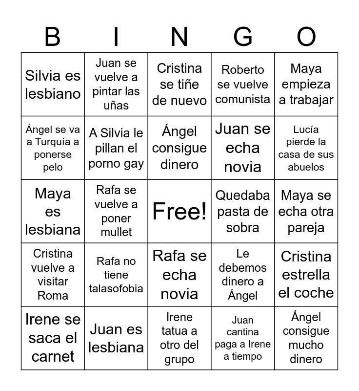 This bingo card has a free space and 24 words: Rafa no tiene talasofobia, Juan es lesbiana, Ángel consigue dinero, Irene se saca el carnet, Maya empieza a trabajar, Silvia es lesbiano, Ángel se va a Turquía a ponerse pelo, Juan se vuelve a pintar las uñas, Quedaba pasta de sobra, Rafa se echa novia, Juan se echa novia, Maya es lesbiana, Le debemos dinero a Ángel, Cristina estrella el coche, A Silvia le pillan el porno gay, Juan cantina paga a Irene a tiempo, Maya se echa otra pareja, Cristina se tiñe de nuevo, Lucía pierde la casa de sus abuelos, Rafa se vuelve a poner mullet, Ángel consigue mucho dinero, Cristina vuelve a visitar Roma, Roberto se vuelve comunista and Irene tatua a otro del grupo.