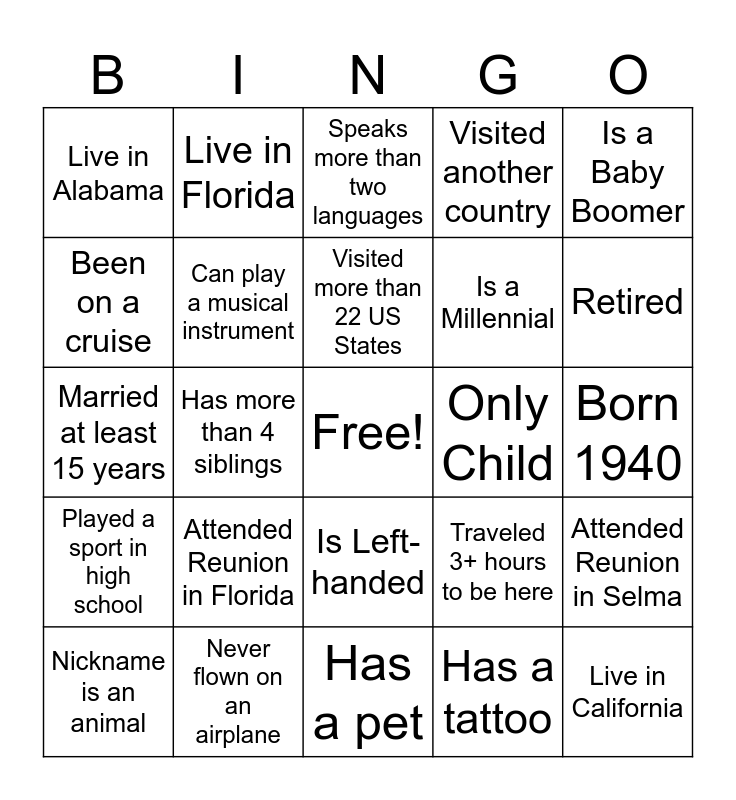 This bingo card has a free space and 24 words: Attended Reunion in Florida, Never flown on an airplane, Visited more than 22 US States, Nickname is an animal, Is a Baby Boomer, Live in Alabama, Been on a cruise, Live in Florida, Only Child, Is Left-handed, Is a Millennial, Married at least 15 years, Traveled 3+ hours to be here, Attended Reunion in Selma, Can play a musical instrument, Has a tattoo, Born 1940, Speaks more than two languages, Retired, Has more than 4 siblings, Live in California, Played a sport in high school, Visited another country and Has a pet.