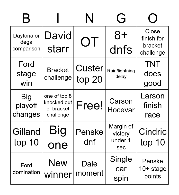 This bingo card has a free space and 24 words: Big one, New winner, Custer top 20, Ford domination, Close finish for bracket challenge, Daytona or dega comparison, Ford stage win, David starr, Carson Hocevar, Penske dnf, Rain/lightning delay, Big playoff changes, Margin of victory under 1 sec, Cindric top 10, Bracket challenge, Single car spin, Larson finish race, OT, TNT does good, one of top 8 knocked out of bracket challenge, Penske 10+ stage points, Gilland top 10, 8+ dnfs and Dale moment.