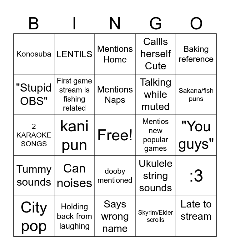 This bingo card has a free space and 24 words: Can noises, Holding back from laughing, Mentions Naps, City pop, Baking reference, Konosuba, "Stupid OBS", LENTILS, Mentios new popular games, dooby mentioned, Talking while muted, 2 KARAOKE SONGS, Ukulele string sounds, :3, First game stream is fishing related, Skyrim/Elder scrolls, "You guys", Mentions Home, Sakana/fish puns, kani pun, Late to stream, Tummy sounds, Callls herself Cute and Says wrong name.