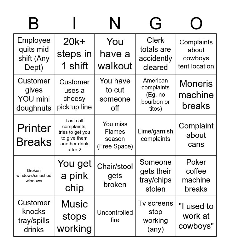 This bingo card has a free space and 29 words: Customer knocks tray/spills drinks, You see someone throw up, Last call complaints, tries to get you to give them another drink after 2, Parking complaints, Employee quits mid shift (Any Dept), You have a walkout, Customer uses a cheesy pick up line, You get a pink chip, Lime/garnish complaints, Music stops working, Complaint about cans, "I used to work at cowboys", Uncontrolled fire, Tv screens stop working (any), Moneris machine breaks, Complaints about casino smell, Chair/stool gets broken, Broken windows/smashed windows, Complaints about cowboys tent location, Printer Breaks, Someone gets their tray/chips stolen, CCR flood, American complaints (Eg. no bourbon or titos), Customer gives YOU mini doughnuts, Clerk totals are accidently cleared, 20k+ steps in 1 shift, Poker coffee machine breaks, You have to cut someone off and Water station flood.