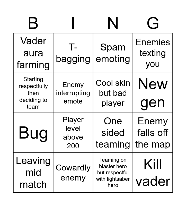 This bingo card has 16 words: Cowardly enemy, Enemy falls off the map, Spam emoting, Vader aura farming, Bug, T-bagging, One sided teaming, Teaming on blaster hero but respectful with lightsaber hero, Starting respectfully then deciding to team, Enemy interrupting emote, Leaving mid match, Enemies texting you, Player level above 200, New gen, Cool skin but bad player and Kill vader.
