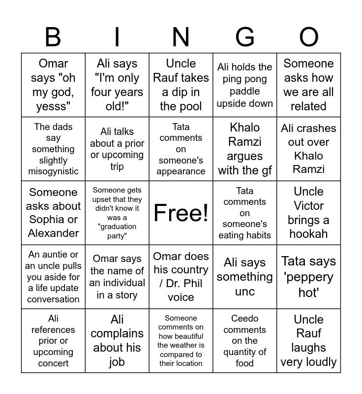 This bingo card has a free space and 24 words: Omar says the name of an individual in a story, Ali complains about his job, Tata comments on someone's appearance, Ali references prior or upcoming concert, Someone asks how we are all related, Omar says "oh my god, yesss", The dads say something slightly misogynistic, Ali says "I'm only four years old!", Tata comments on someone's eating habits, Omar does his country / Dr. Phil voice, Khalo Ramzi argues with the gf, Someone asks about Sophia or Alexander, Ali says something unc, Tata says 'peppery hot', Ali talks about a prior or upcoming trip, Ceedo comments on the quantity of food, Uncle Victor brings a hookah, Uncle Rauf takes a dip in the pool, Ali crashes out over Khalo Ramzi, Someone gets upset that they didn't know it was a "graduation party", Uncle Rauf laughs very loudly, An auntie or an uncle pulls you aside for a life update conversation, Ali holds the ping pong paddle upside down and Someone comments on how beautiful the weather is compared to their location.