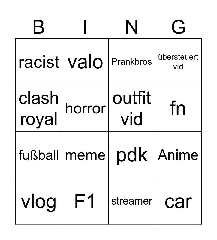 This bingo card has 16 words: F1, Anime, Prankbros, racist, fußball, valo, pdk, streamer, clash royal, horror, vlog, übersteuert vid, meme, fn, outfit vid and car.