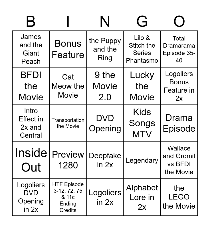 This bingo card has 43 words: Opening AMC Preview, DVD Opening, Logoliers Opening AMC Preview in 2x, Logoliers DVD Opening in 2x, Movie, Alphabet Lore in 2x, the Puppy and the Ring, BFDI Episode 10-12, Total Dramarama Episode 35-40, HTF Episode 3-12, 72, 75 & 11c Ending Credits, Lilo & Stitch the Series Phantasmo, Kids Songs MTV, Deepfake in 2x, Preview 1280, Title Nasir790, Logoliers in 2x, Mr Incredible Becoming Old, Intro Effect in 2x and Central, Wallace and Gromit Grand Adventures in 2x, Logoliers Bonus Feature in 2x, Bonus Feature, Magic the America Sauce, Disney Pixar & Nickelodeon & Other Toy Story 3, James and the Giant Peach, Elemental, Drama Episode, HTF Definitely Not a Shadbid, Coraline, Legendary, Inside Out, Lightyear, Wallace and Gromit vs BFDI the Movie, Scary Movie, Transportation the Movie, the Learning Station the Movie, PJ Masks the Movie, the LEGO the Movie, 9 the Movie 2.0, BFDI the Movie, Lucky the Movie, DVD the Movie, Cat Meow the Movie and DVD Closing.